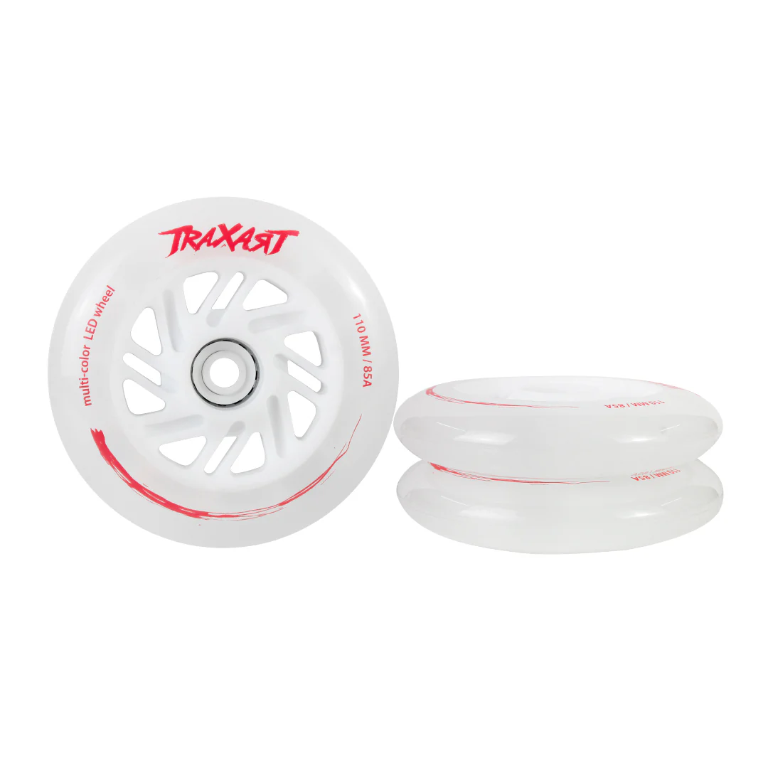 O Jogo de rodas inline Traxart LED Multicolor são rodas de poliuretano (PU) em 110mm com uma dureza de 85A. A principal característica destas rodas é que elas já vêm com LEDs, que acendem automaticamente conforme você se movimenta, criando um efeito incrível de luzes que mudam de cor conforme o patinador patina.
