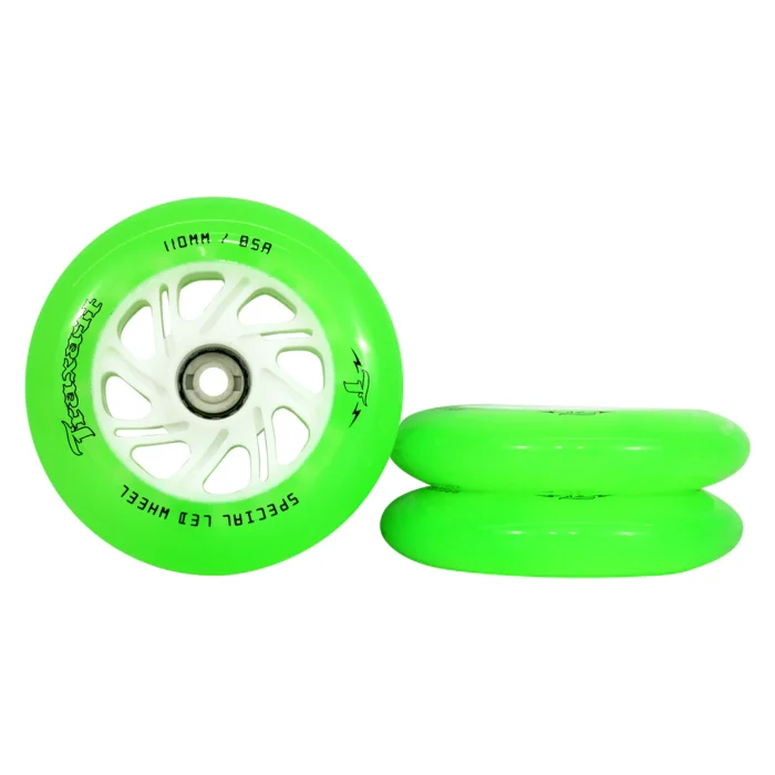 O jogo de 3 rodas inline Traxart LED Special 110mm são rodas de poliuretano (PU) em 110mm com dureza 85A. O diferencial dessa roda é que a roda já vem com a cor da LED, e conforme o patinador patina, as rodas ascendem. Destaque também para dureza 85A.