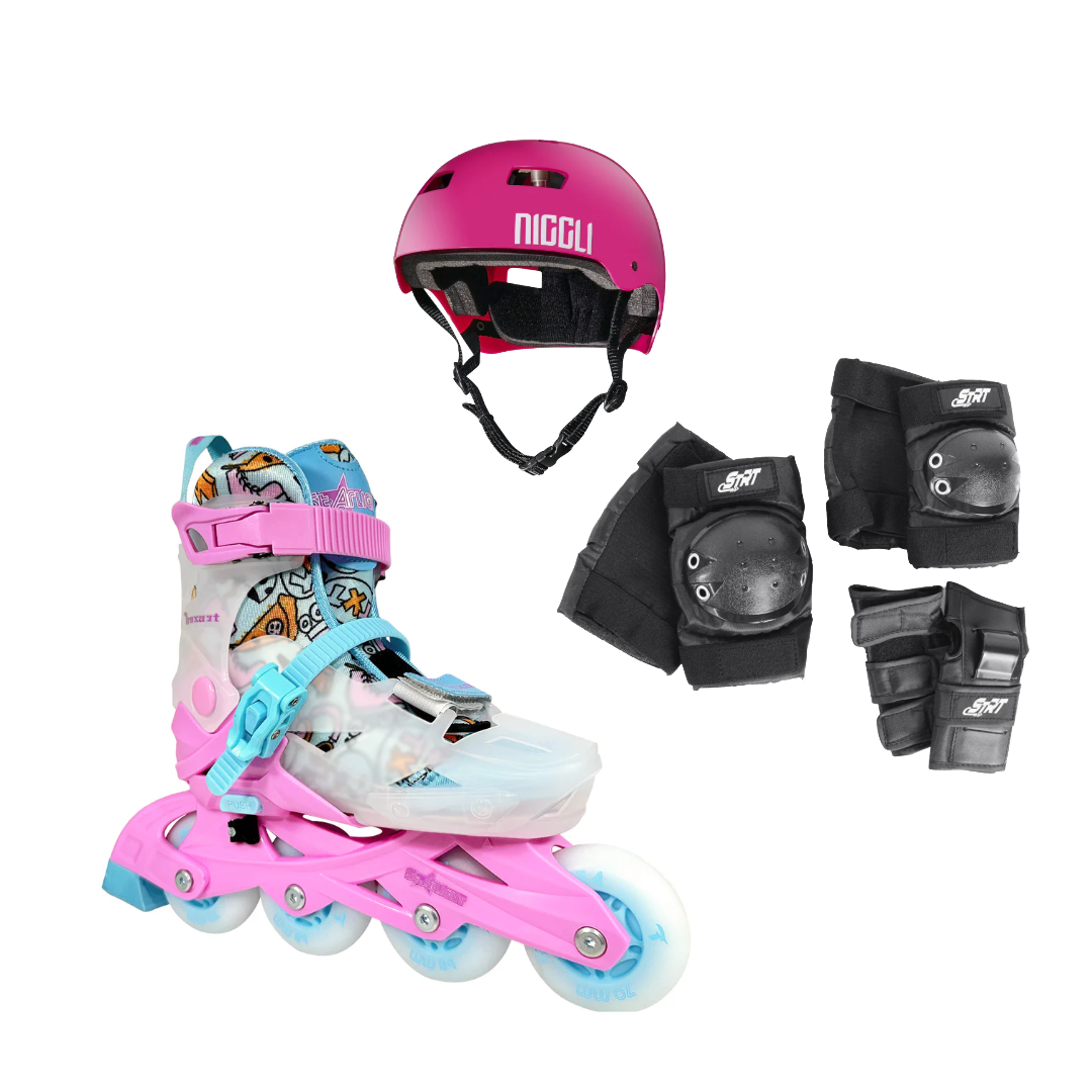 O Patins Infantil StarLight é o mais recente lançamento da Traxart. Esse modelo apresenta um design inovador, com a bota interna estampada e a externa transparente. Oferecendo uma experiência segura e divertida com rodas de LED coloridas. Desenvolvido com um sistema expansível que pode ser ajustado conforme o crescimento do patinador, e uma trava que auxilia no controle da velocidade. Suporta até 60kg