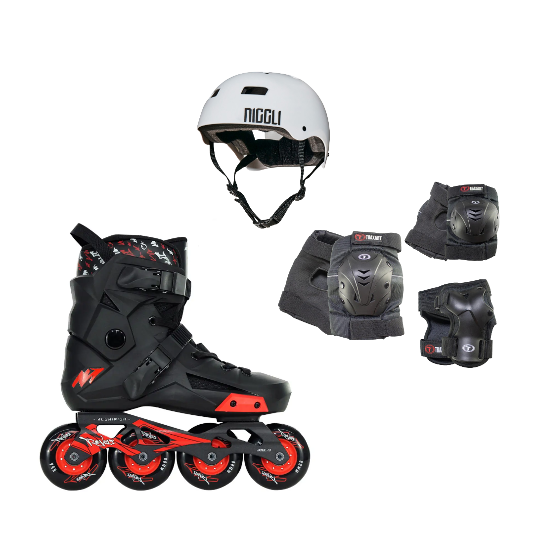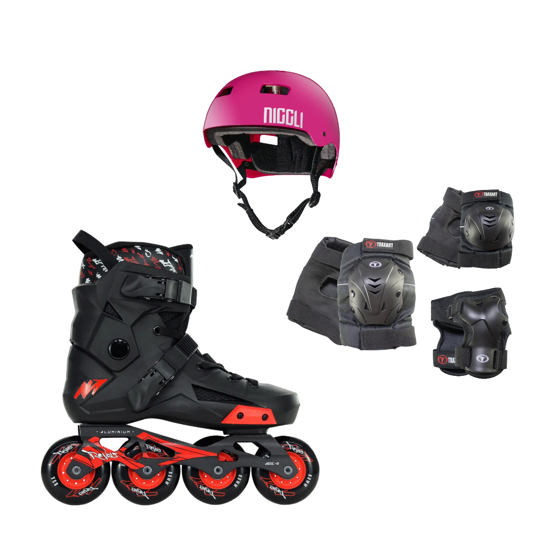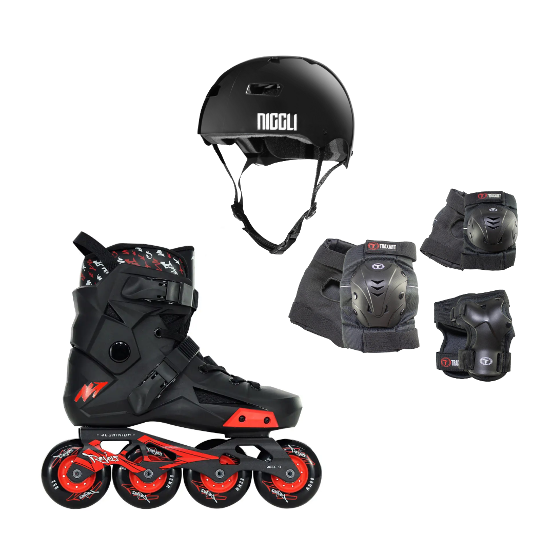 O Patins Freestyle Urban Traxart Revolt com Rodas Pretas é uma nova versão do tradicional revolt, mas com rodas pretas e cubo vermelho. Modelo com o design bem arrojado e indicado para quem procura um patins da linha freestyle urban: patinação na rua que envolve saltos e descida de escadas, etc. Suporta até 120kg.